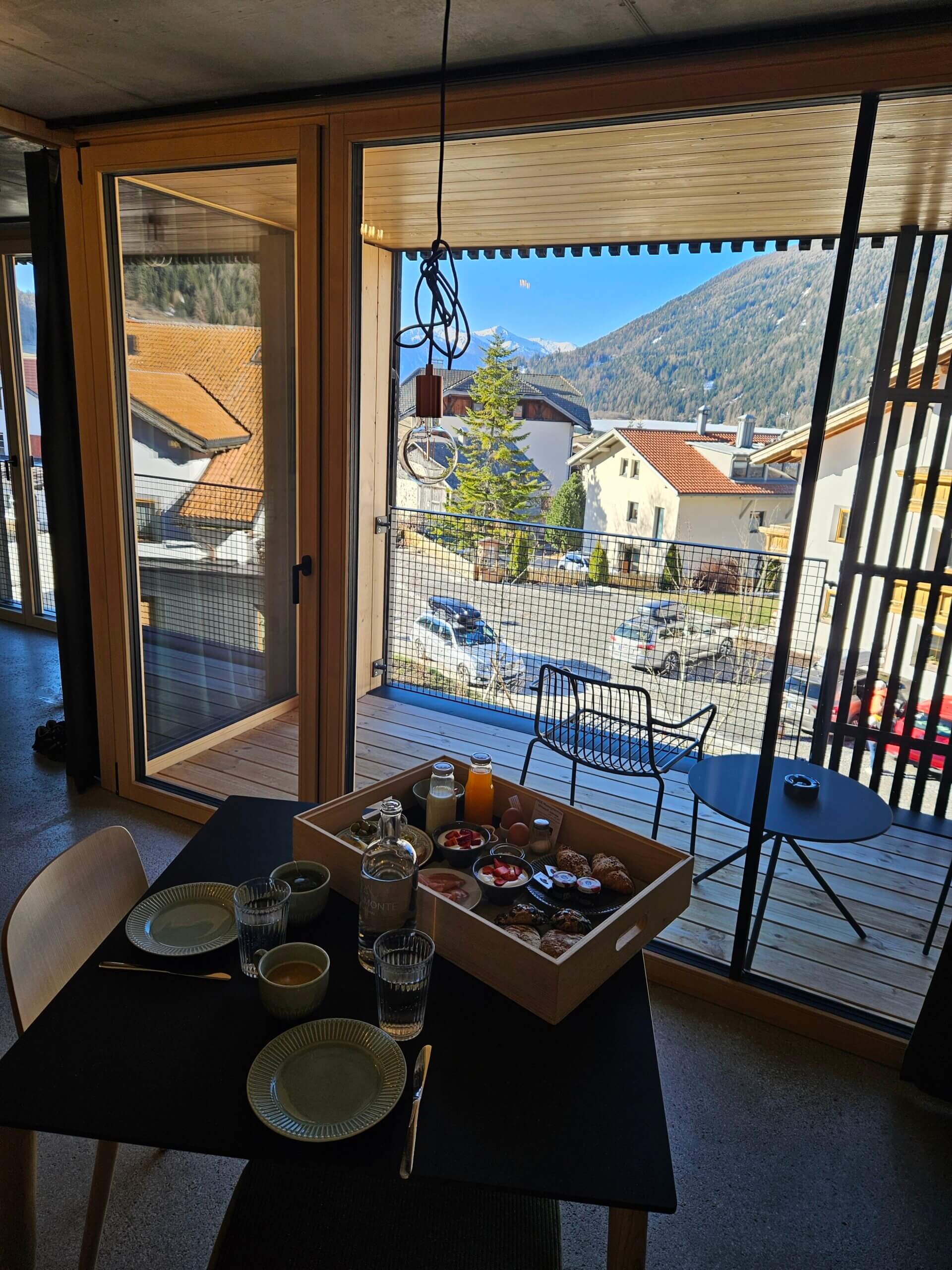 Durch eine Schiebetür aus Holz gelangt man in das gemütliche Schlafzimmer und durch eine andere Tür in das Bad mit schwarzen Fliesen und Kupferamaturen. Und dann sind da noch die grossen Fenster und der Balkon mit Blick auf die schneebedeckten Gipfel des Ortlermassivs. Die Sonne scheint herein und taucht den Raum in ein angenehmes Licht, es ist eine harmonische Mischung aus Minimalismus und Wärme, in der wir uns sofort willkommen fühlen.