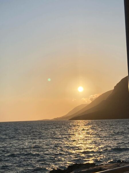 Erinnere mich bitte nicht daran! Ein paar mini-Quallen-Verletzungen haben mich schon ziemlich aus der Bahn geworfen, aber natürlich haben die griechischen Skipper funktionierende Geheimtipps (mit der Kreditkarte drüber reiben?!) für empfindliche Schwimmer*innen. Delfine – haben wir tatsächlich in ca. 100 m Entfernung gesehen! Haie? Nicht im Mittelmeer. Zum Glück.